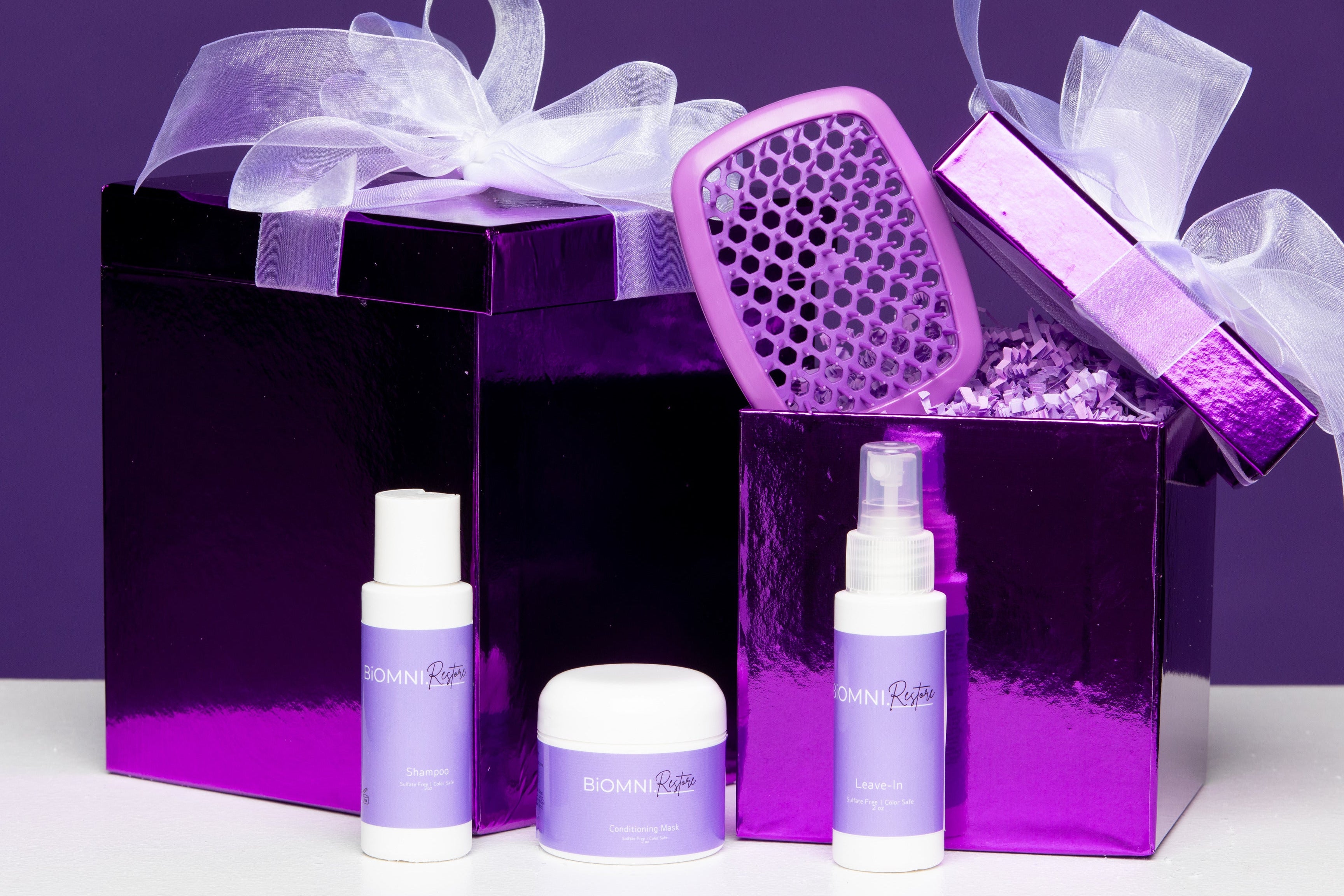 Meet the limited-edition Holiday Mini Beauty Bundle, featuring our travel-size Restore Collection and the BiOMNI Detangling & Smoothing Brush — the perfect duo for nourishment, shine, and effortless styling on the go.